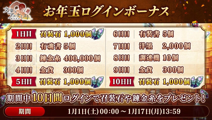 お正月を記念して、期間中ログインすると最大で召装石3000個(召装10回分)や錬金糸など豪華アイテムをプレゼント!