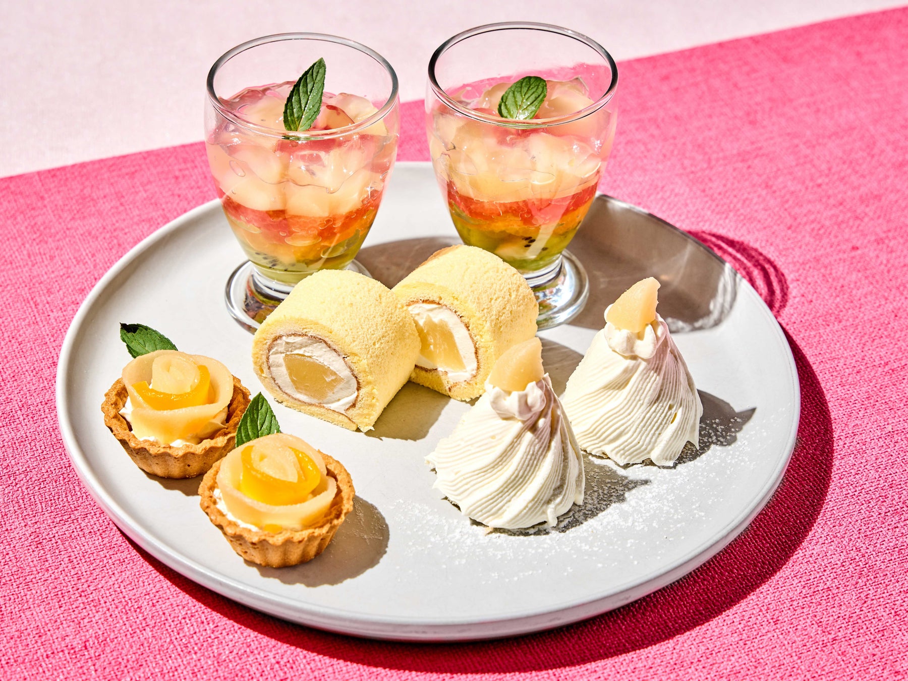 生クリームの中にフランボワーズクリームと桃の果肉が入った甘酸っぱい味わいのピーチショートケーキや、さわやかなレモンの香りと、甘美なホワイトチョコレートのハーモニーをお楽しみいただけるスコーンは贅沢な味わいに。さらに、ひときわ輝きを放つ4種のフルーツが入ったピーチゼリーや、ミルクティーの甘さが引き立つ、カソナード(※)の香りとほろ苦さに手が止まらないアールグレイブリュレなど、こだわりのデザートが並びます。
