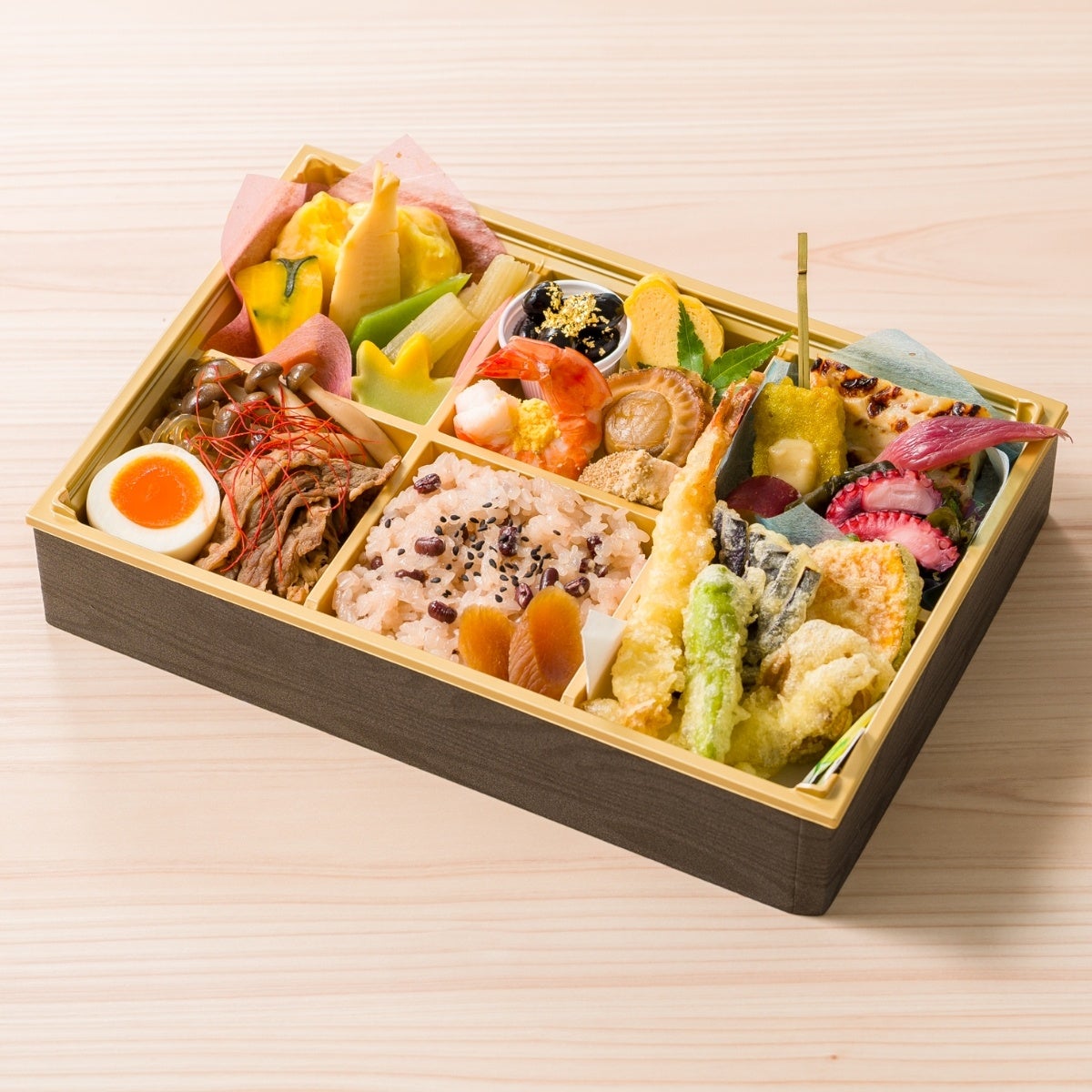 天ぷら、すき焼き、焼き魚、煮物、赤飯、などが入った六つ仕切りのお弁当。