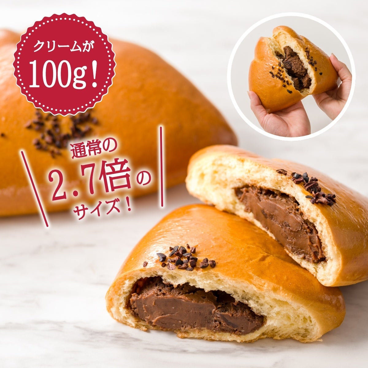 100周年を記念して100gのベルギーチョコレートクリームを入れました。通常の2.7倍のクリームはずっしりと重たく食べ応えも抜群です。