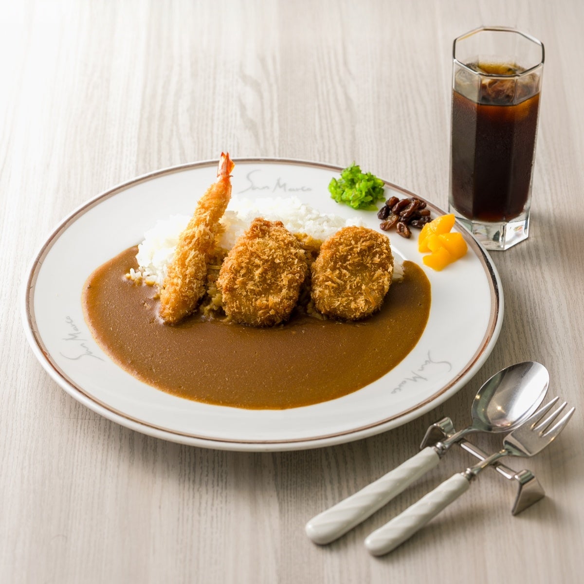 10時から11時までに入店、店内でお食事されたお客様にアイスコーヒーをサービス!写真はエビフライとヒレカツで「100」を作った100周年記念カレー(税込999円)