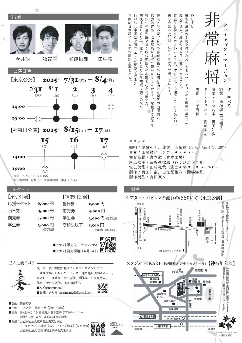三人之会第三回公演『非常麻将』が以下の通り二会場で上演されます。
