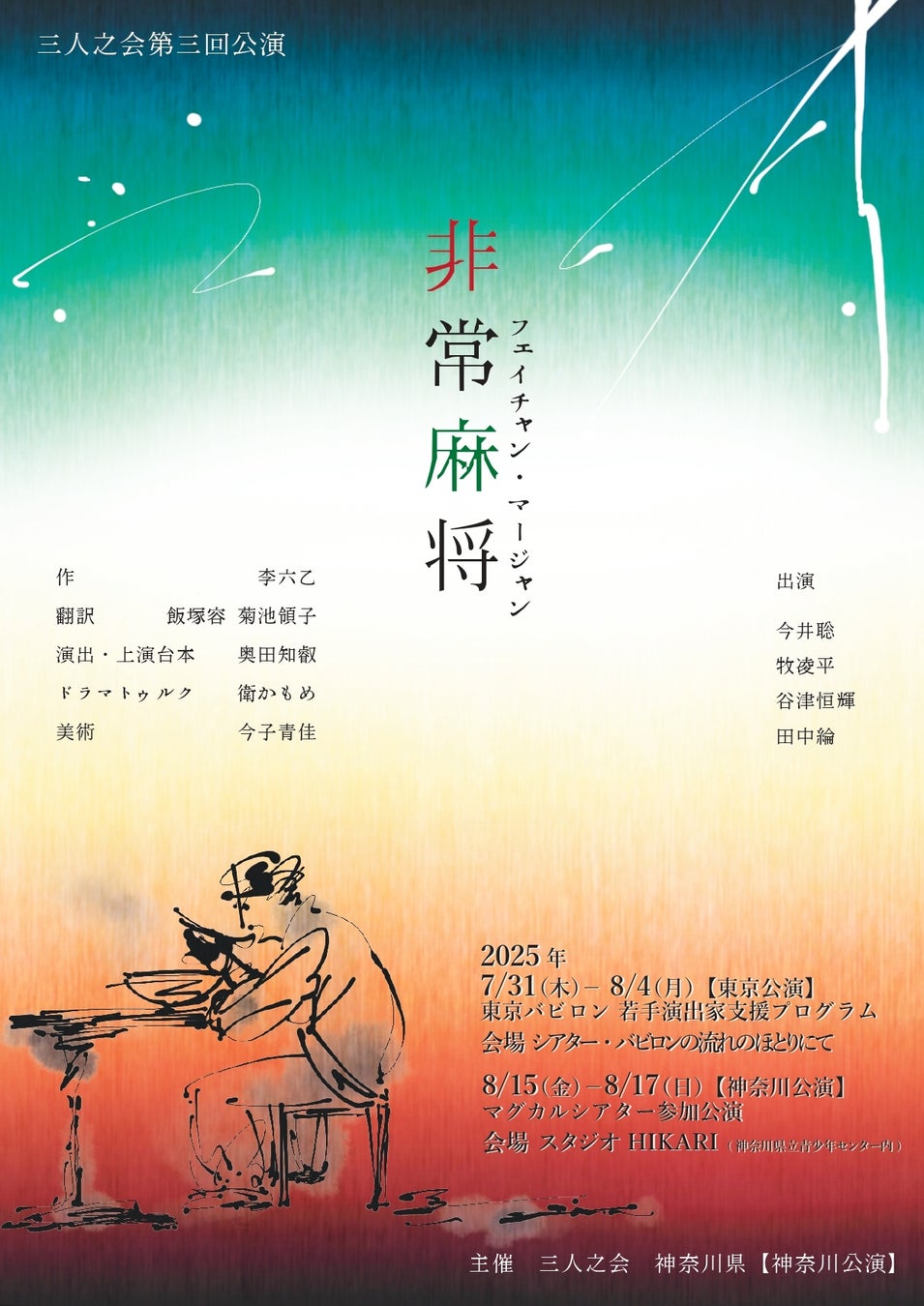 演出家・奥田知叡のもと、中国演劇や能を題材に領域横断型の舞台芸術作品を制作している演劇ユニット「三人之会」。活動開始から3年目となる2025年は、現代中国演劇の名作『非常麻将(フェイチャン・マージャン)』を上演する。