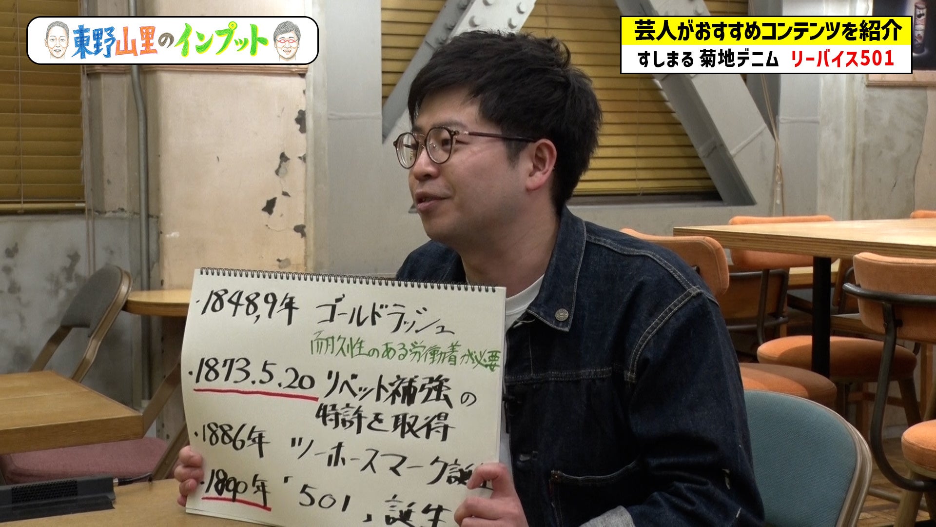 YouTubeを通して勉強していることもあってデニムに詳しい東野に対し、山里にとっては未知の世界。菊地はそんな2人にデニムの歴史から語ります。