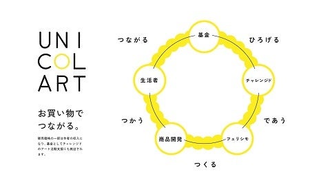 UNICOLART [ユニカラート]とは、unique・color・artを合わせた造語。アートを通してチャレンジドの可能性を広げる社会の実現を、みんなで目指すプロジェクトです。チャレンジドが描いた作品を、プランナーやデザイナー、メーカーが一緒になって、生活者の手元に商品としてお届けします。チャレンジドと社会をアートでつなぎ、距離を縮め、知り合うきっかけをつくります。