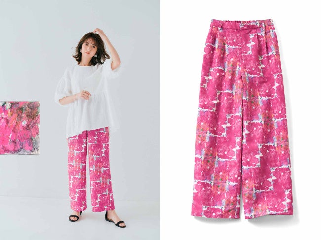 華のような絵の具のピンクと水彩色鉛筆の直線が混ざった宮本憲史朗さんの抽象作品をフェリシモがテキスタイルにアレンジしました。大人が着やすいストンとしたシルエットで、鮮やかなピンクがコーディネイトに華やぎをプラスします。
