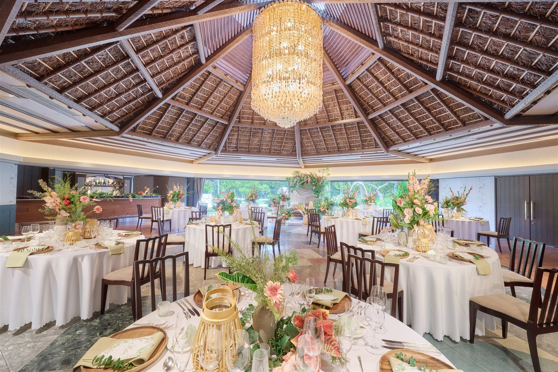 愛犬と大切な人達に見守られた挙式の後は、椰子の木をはじめとした木々が一面に広がるプールサイドに佇むプライベートヴィラ「Shell House(シェルハウス)」 での披露宴へ。広々としたガーデンとプールサイドを貸切にできるため、愛犬ものびのび過ごせます。南国リゾートを思わせる開放感抜群の空間で、特別な日をリラックスしてお過ごしください。