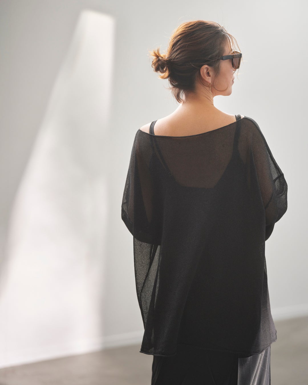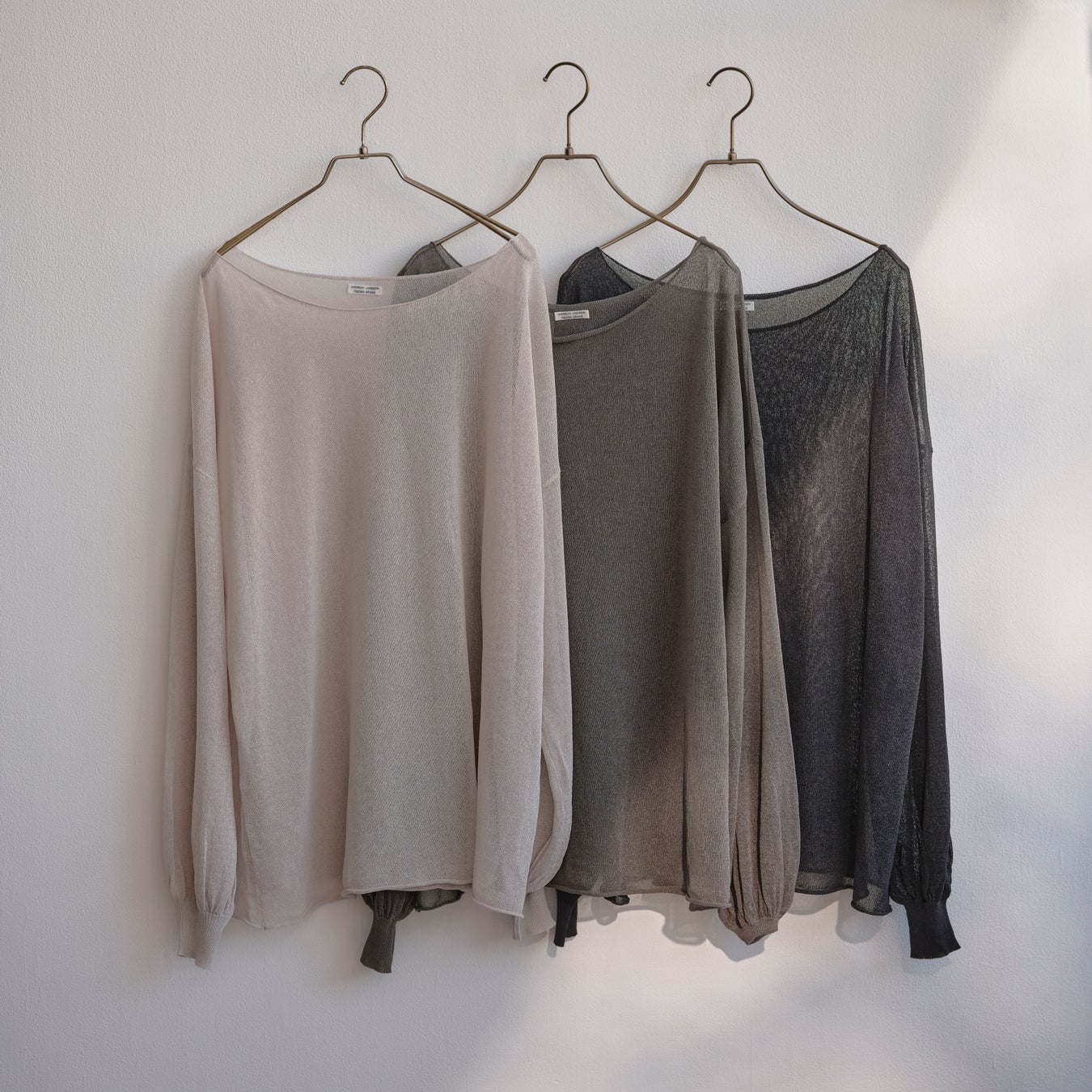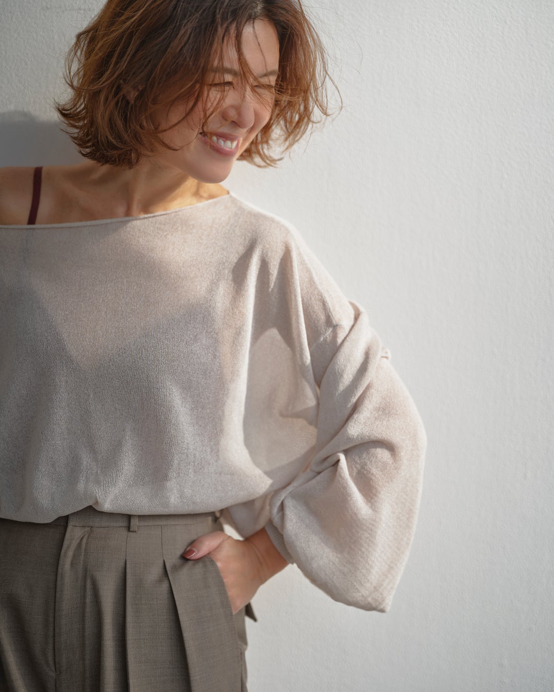 WASHIFABRIC®の糸で編める極限の薄さで編み立てた、透け感のあるボリュームシアーニットです。型からギリギリ落ちないボートネックラインが女性らしさを演出してくれます。