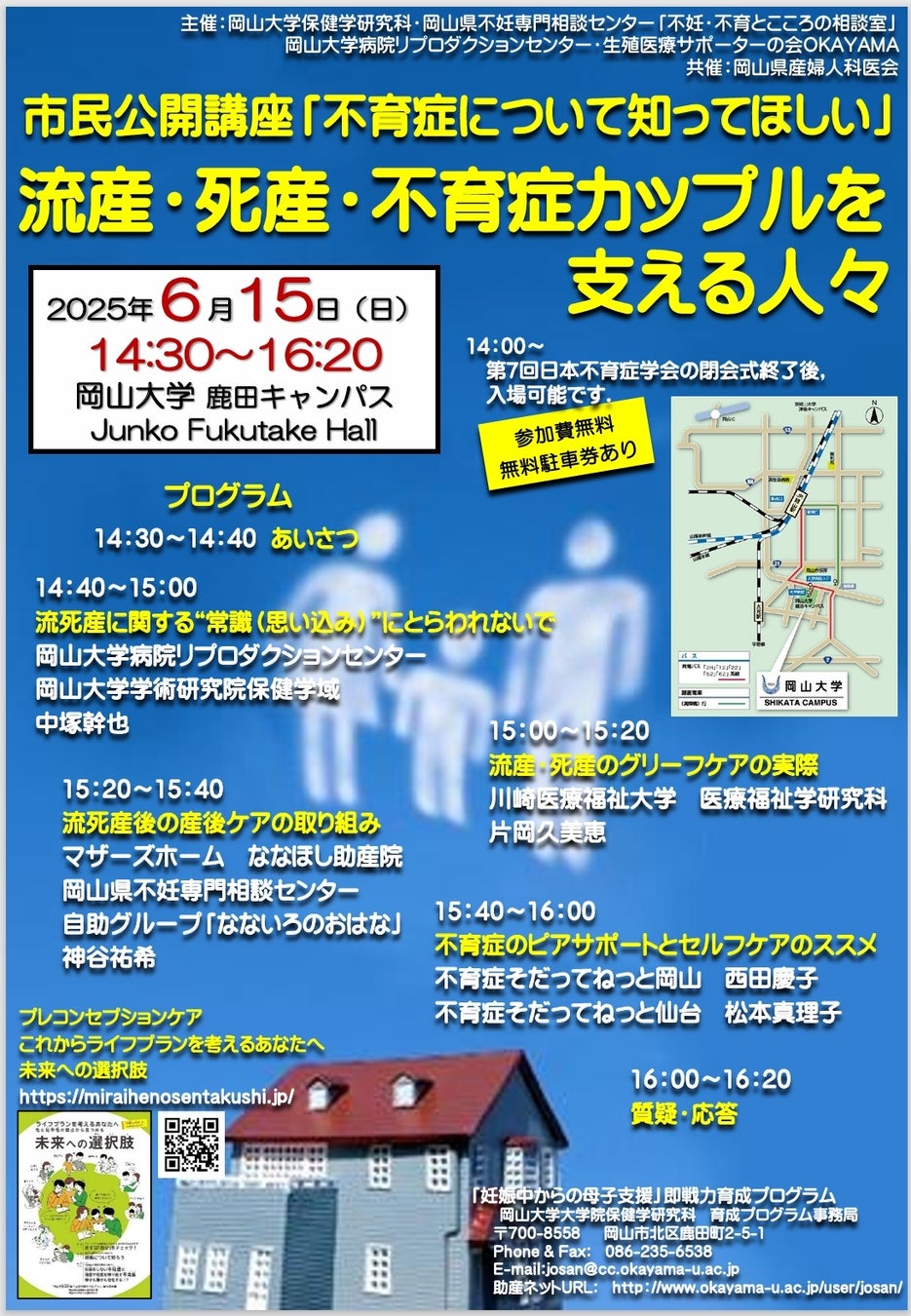 【岡山大学】市民公開講座「不育症について知ってほしい」流産・死産・不育症カップルを支える人々〔6/15,日 岡山大学鹿田キャンパス〕