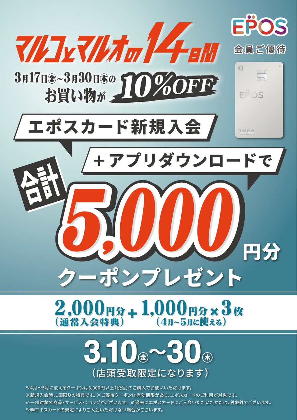 エポスカードをお持ちでないお客さまは、新規ご入会で10%OFFの優待に加え、ご入会特典の2,000円分クーポンもご利用いただけます。さらに、エポスカードの「新規ご入会+アプリダウンロード」で、2023年4月1日(土)~5月31日(水)にご利用いただける1,000円分×3枚のクーポンをプレゼントいたします。