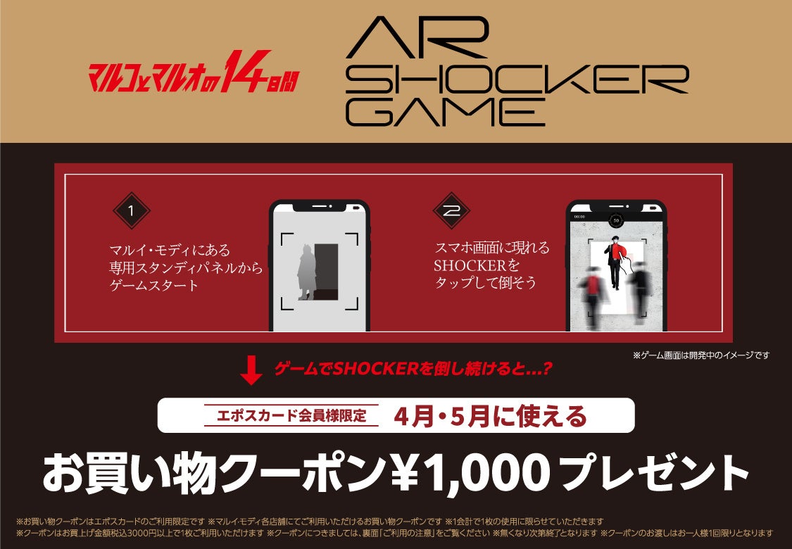 『シン・仮面ライダー』に登場するSHOCKER(ショッカー)をスマートフォンで倒す「AR SHOCKER GAME」をマルイ・モディ全店で開催いたします。店舗にある専用スタンディパネルからゲームに参加いただけます。ARのショッカーを倒し続けると、2023年4月1日(土)~5月31日(水)にご利用いただける1,000円分のクーポンをプレゼントいたします。