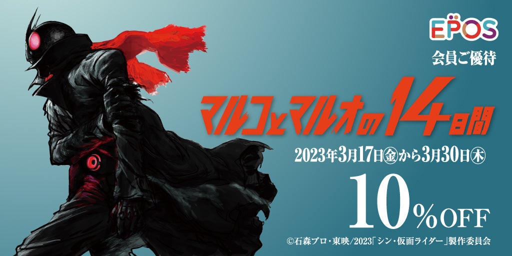 株式会社丸井(本社:東京都中野区、代表取締役社長:青野 真博)は、2023年3月17日(金)~3月30日(木)の14日間、マルイ・モディ全店およびマルイのネット通販「マルイウェブチャネル」にて、エポスカード会員ご優待キャンペーン『マルコとマルオの14日間』を開催いたします。期間中、エポスカードのクレジットでのお支払いで、10%OFFにてお買物いただけます。また、今回の『マルコとマルオの14日間』は、『シン・仮面ライダー』の映画公開に合わせ、『シン・仮面ライダー』とのコラボレーション企画を実施いたします。