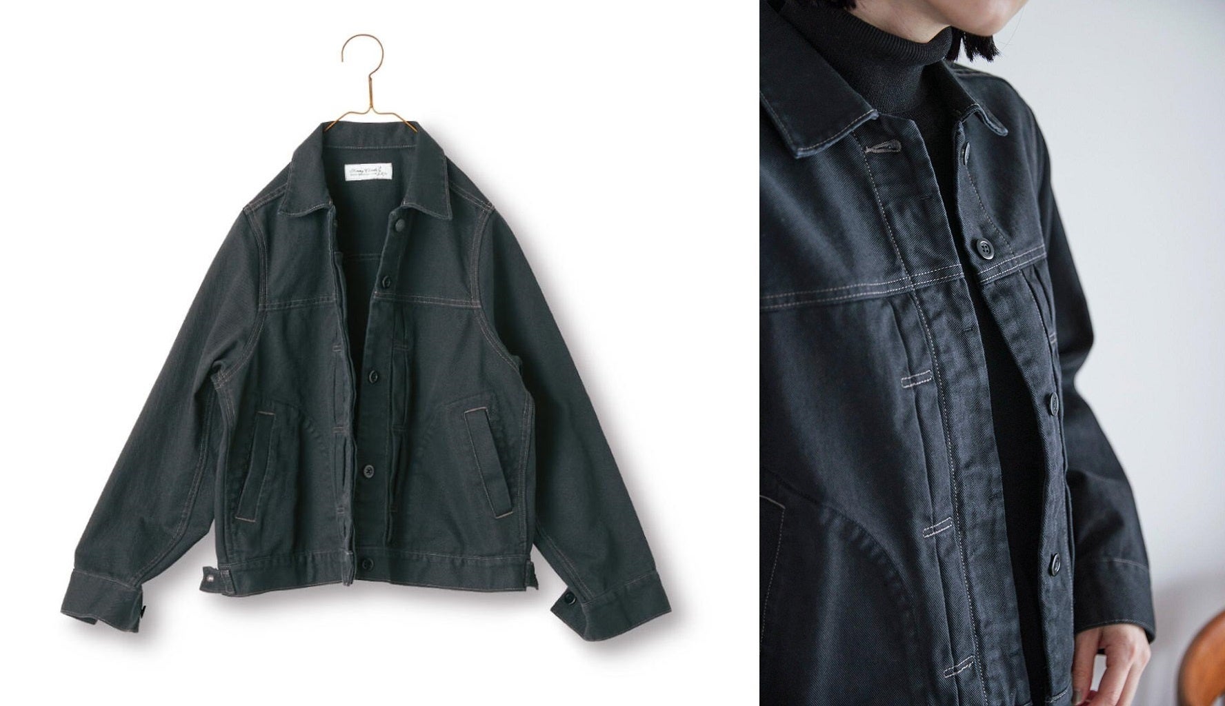 魔女のワンピースと相性の良い、黒いジージャンです。厚手の黒いツイル生地で仕立て、グレーのステッチでカジュアル感を加えました。第一ボタン以外は比翼始末にして、すっきりとした印象を演出します。魔女ワンピースとは好相性で、カジュアルかつ上品なデザインが、個性的で洗練されたスタイルを演出します。