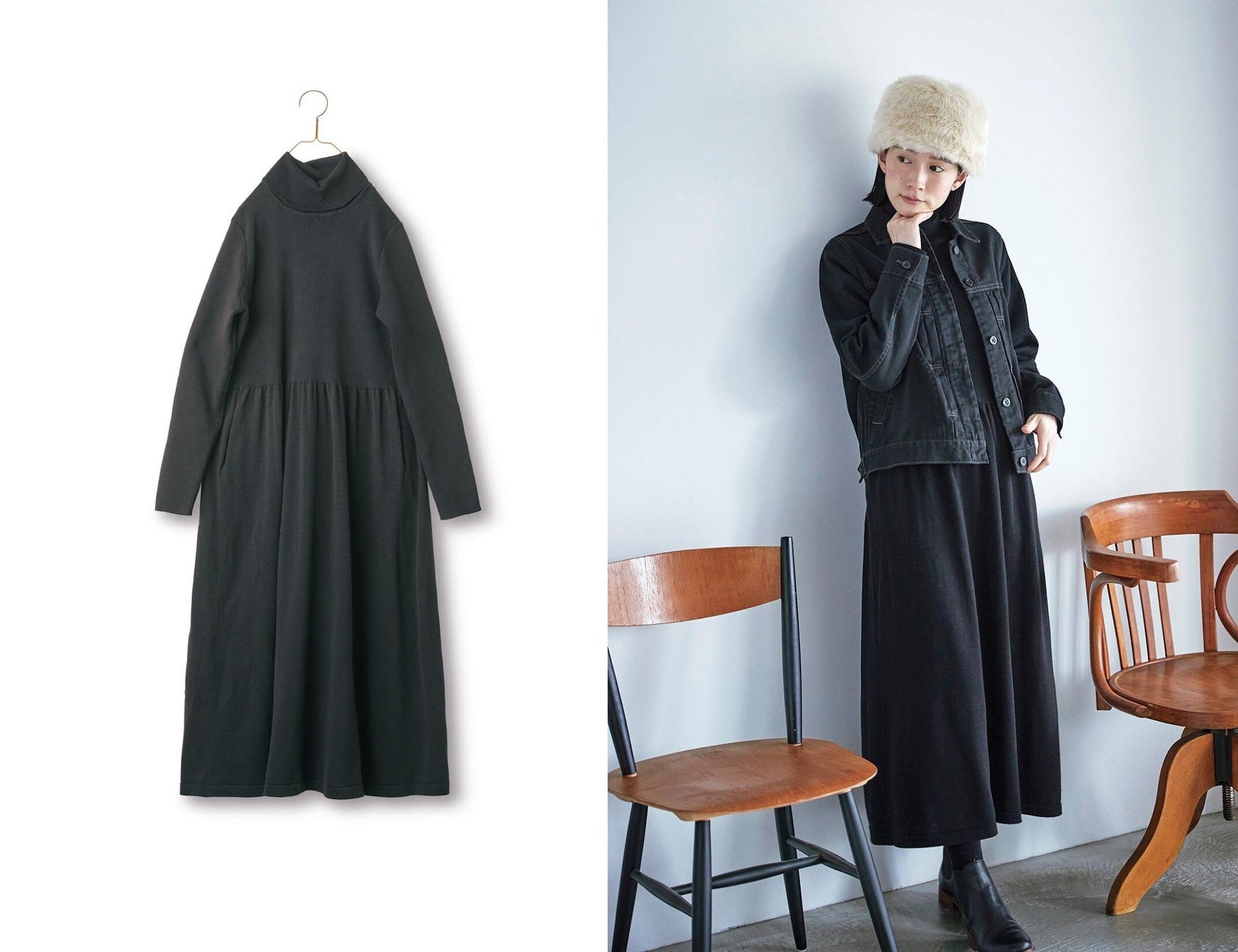 シンプルなタートルデザインの、まるで魔女のように上品な雰囲気のワンピースです。上半身はすっきり、スカート部分にボリュームを加え、ウエスト切り替え位置を少し上げています。スタイリッシュなデザインなので、シンプルで洗練されたファッションを楽しめます。