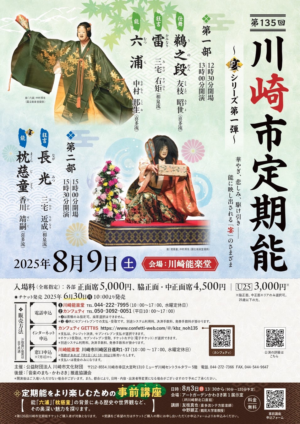 公益財団法人川崎市文化財団主催、『第135回川崎市定期能<喜多流>~宴シリーズ第一弾~』が2025年8月9日 (土)に川崎能楽堂(神奈川県 川崎市川崎区 日進町 1-37)にて上演されます。