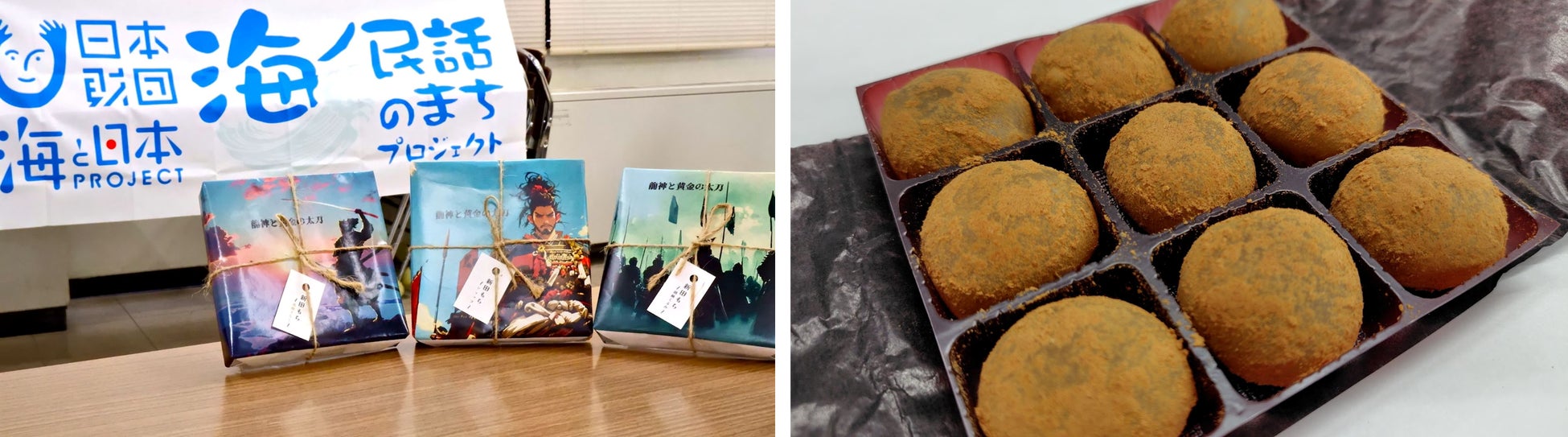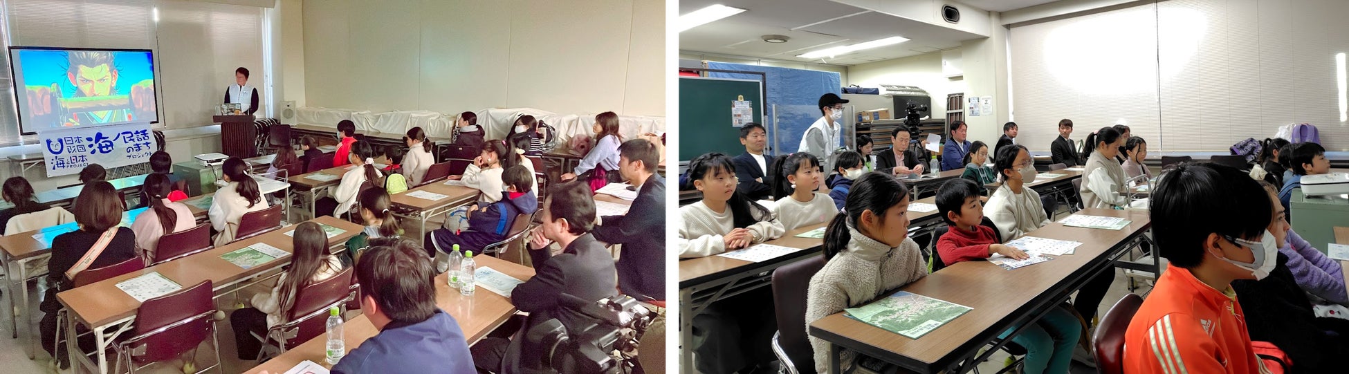 ■アニメ上映 ・海と日本プロジェクト「海ノ民話のまちプロジェクト」概要説明 ・海ノ民話アニメーション「龍神と黄金の太刀」上映 ■海ノ民話の授業 講師:鎌倉市図書館 河合真帆 氏 授業タイトル:新田義貞と稲村ヶ崎の海について ■声優体験 ゲスト:海ノ民話アニメーション監督 沼田心之介 氏 ゲスト:海ノ民話アニメーション声優 四宮豪 氏 ・沼田監督によるアニメの制作解説 ・四宮氏によるアニメの声優実演披露 ・参加児童の声優体験 ■コラボ菓子の紹介 協力:菓子屋中島 中島隼人 氏 ・「龍神と黄金の太刀」コラボ菓子のお披露目 |