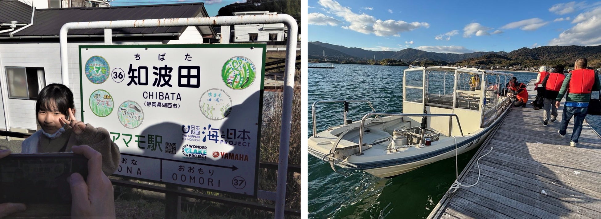 アマモ列車の中では、クイズに答えたり、浜名湖ワンダーレイク・プロジェクト有識者委員会の山田祐己委員による説明を聞いたりして約1時間過ごした後、列車はアマモ駅に到着。アマモ駅は、39ある天竜浜名湖鉄道の駅のうち「知波田駅」の副駅名として命名されたもので、2025年3月まで期間限定で、特別な駅名看板になっています。このアマモ駅でアマモ列車を途中下車したあと、ヤマハマリーナ浜名湖の桟橋から遊覧船に乗って、浜名湖を見学しました。かつてアマモがたくさん茂っていた松見ヶ浦でも、現在ほとんどアマモが見られなくなってしまいましたが、これから復活が期待できる場所であることから、船上からタネを撒きました。