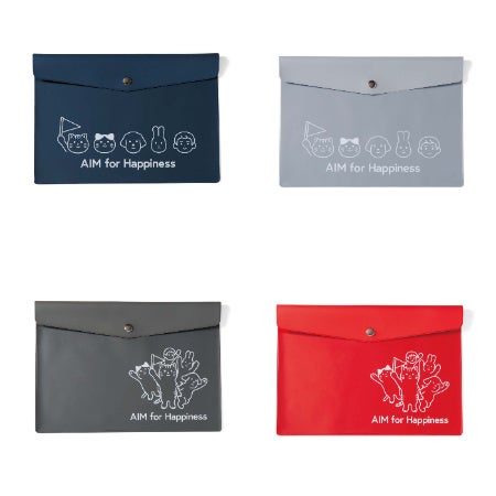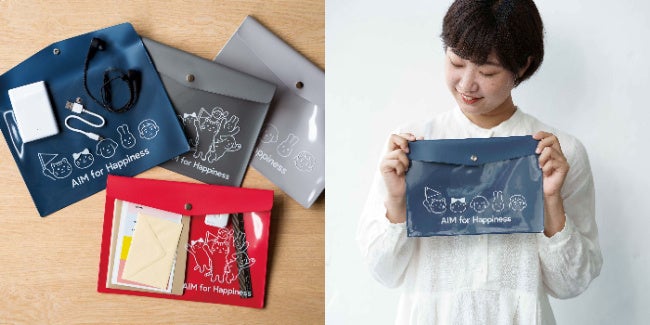 表面はクリアになっているので、中身がすぐに見えます。かばんの中で散らかりがちな小物や文房具などをスマートに収納できて便利です。カラーは〈ネイビー〉〈ライトグレー〉〈ダークグレー〉〈レッド〉の4種類。イラストのデザインは2種類あります。