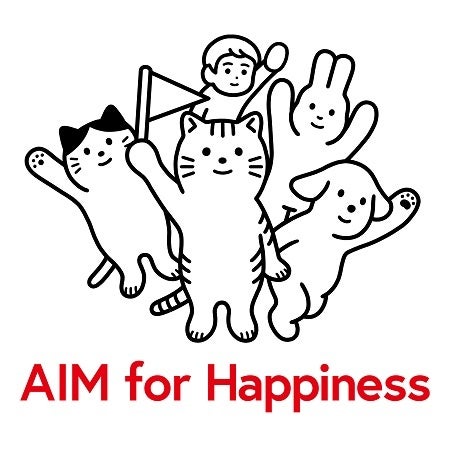 「AIMタンパク質」の「AIM(エーアイエム)」を、英語で「ねらう」や「目指す」などを意味する「AIM(エイム)」になぞらえ、「みんなでしあわせな未来を目指そう」という思いを込めたスローガンです。