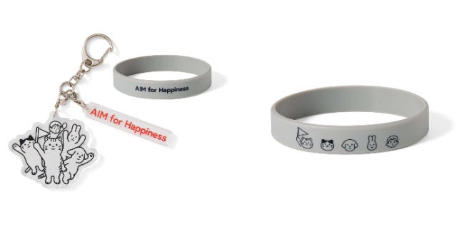 猫や動物たちが仲よく並んだイラストと「AIM for Happiness」のメッセージが添えられています。リストバンドはラバー素材なので、伸びがよく手首に簡単に装着できます。キーホルダーはスローガンと動物たちの2連デザインです。