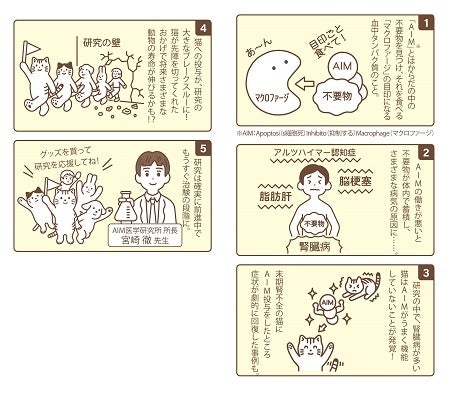 私たちは、タンパク質の「AIM」に注目し、腎臓病をはじめこれまで治らなかった多くの病気の治療法の研究開発に取り組んでいます。2022年4月には、一般社団法人AIM医学研究所(略称IAM)を設立。愛猫家さんの切なる願いにこたえるため、先行して猫用のAIM医薬の完成へと歩みを進めています。近い将来、猫でも人でも今まで治らなかった病気をひとつでも多く治すことができるよう、努力を続けてまいります。どうぞ応援、よろしくお願いいたします。