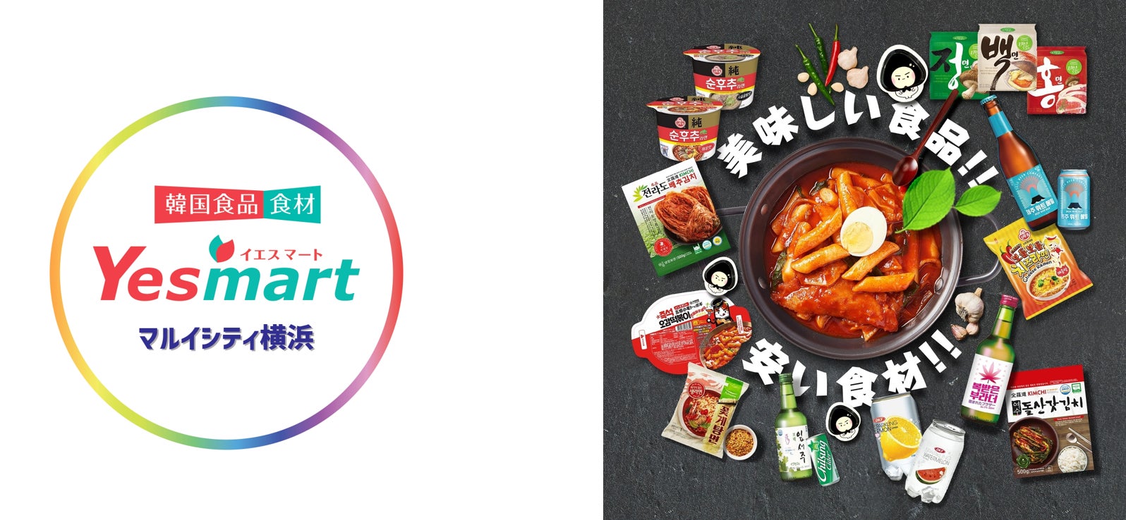 日本最大級の韓国食品スーパー Yesmartが横浜に上陸。本場の雰囲気あふれる韓国スーパーです。韓国で売られているインスタント麺やスナック、お酒、レトルト商品など、生鮮食品から冷蔵・冷凍食品まで豊富な品揃えが魅力。オモニ(お母さん)の味の韓国弁当や、忙しい方にうれしいミールキットから、韓国人店長が足を運んで厳選した、ほかの韓国スーパーにはない商品まで!