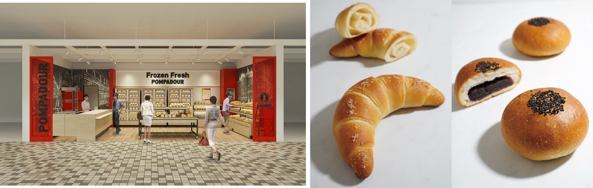 ポンパドウルの新コンセプト業態。長年培ってきた製パン技術と冷凍技術を活かし、冷凍したまま焼成できる専用オーブンを開発。いつでも焼きたてを最高の品質で提供し、限りなくフードロスを抑える店づくりを実現。品切れによりお目当てのパンが陳列されていない場合は、ご注文後、専用オーブンで温めた「焼きたて」をご提供します。さらに冷凍ショーケースを常設し、自然解凍でもおいしい冷凍パンも販売。