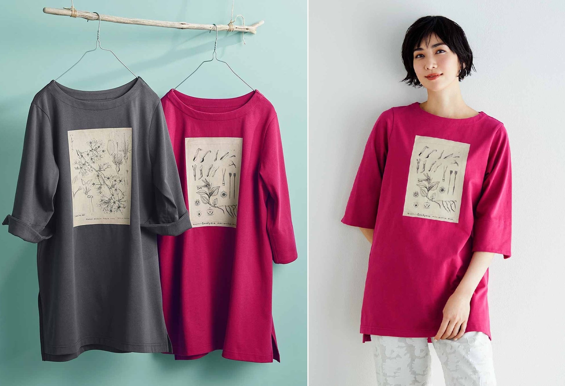 牧野博士の緻密な植物図を胸元にプリントした、細身のパンツに合わせるだけで着映えも体形カバーもかなえるすっきり見えするロング丈のトップスです。きれいめに仕上げたボートネック、折り返してもおしゃれなスリット入りの六分袖、前後差のあるすそ、とこなれ感のある女性らしいデザインです。