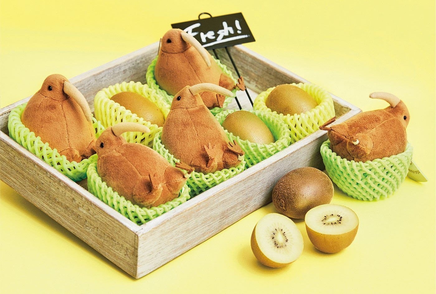 日本で唯一キーウィを飼育している「天王寺動物園」とコラボした、キウイフルーツのまねをしたキーウィのミニマスコットのゴールデンキウイバージョンです。贈答品のようにフルーツキャップに入って座る姿に思わず“きゅん”としてしまいます。