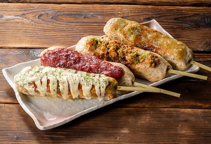 北海道産若鶏のジャンボつくね、ダブルチーズつくね、梅つくね、山わさびつくね、鬼おろし【実演】 税込600円~