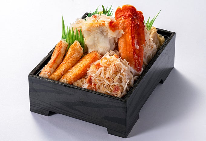 カニのほぐし身は通常のお弁当に使用する量の約3倍!毛蟹、ズワイ、タラバの3種のカニを一度に味わえる贅沢な1折です。