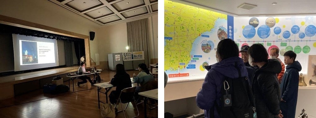当日は生憎の雨と強風で撮影はできませんでしたが、室内講習では灯台の存在意義や星との親和性などを紹介し、撮影講習をスタートしました。星景写真撮影の基本から、美しく聳え立つ野島埼灯台と煌めく冬の星々を撮影するためのポイントを、ガイドがわかりやすく説明しました。室内講習が終了し、野島埼灯台へと移動。夜間特別開放された灯台に登りレンズ室を見学し資料展示室のきらりん館では海上保安官による灯台説明に耳を傾けました。