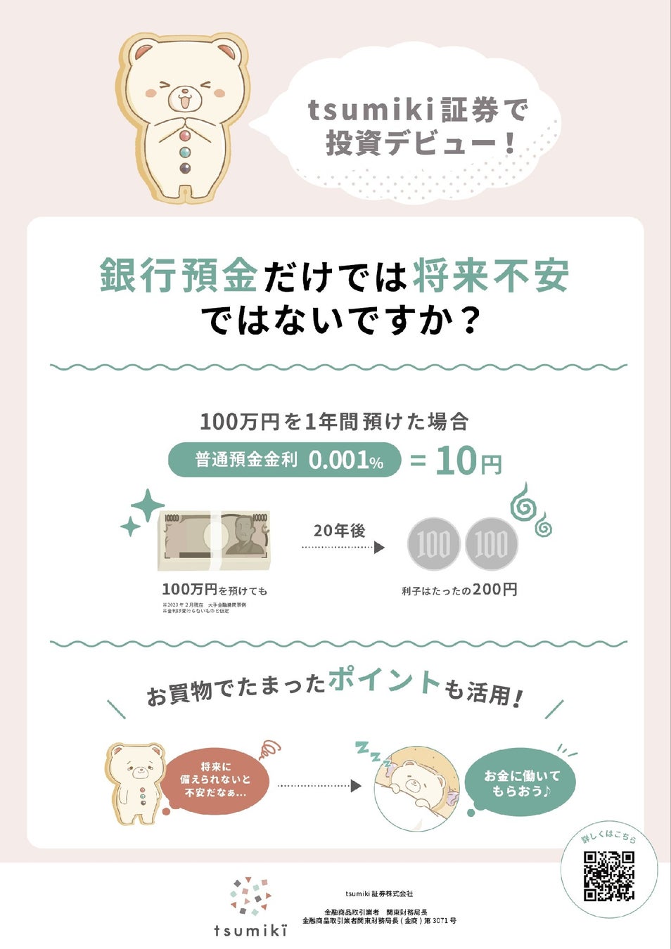 生徒の皆さまに投資のイメージを聞いたところ、「投資には難しく、怖いイメージがある」という声がありました。そんなイメージを少しでも払拭できるよう、tsumiki証券について「ゆるっと」をテーマに親しみやすいデザインで作成し、新宿マルイ 本館・新宿マルイ アネックス・新宿マルイ メン館内のポスターやデジタルサイネージで紹介します。