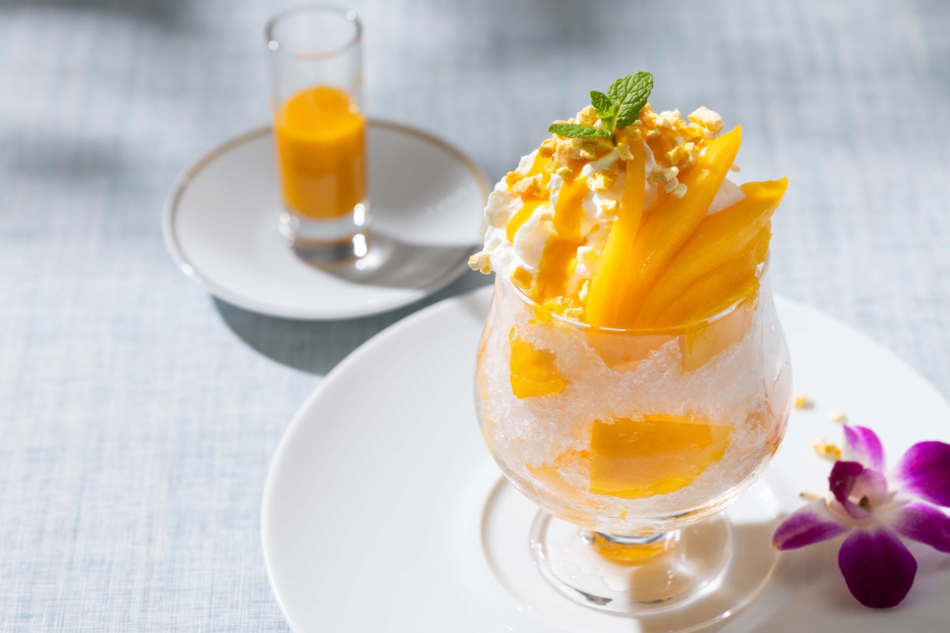 フレッシュなマンゴー、マンゴーピュレ、ドライマンゴーを組み合わせた、“マンゴーづくし”のリッチな味わい。マンゴーのとろける果肉と氷の冷たさ、バニラアイスクリームとバニラのエスプーマの濃厚さが絡み合う一品です。サイドに添えたマンゴーソースをかけることで、ひと匙ごとに変わる味わいのハーモニーをお楽しみいただけます。