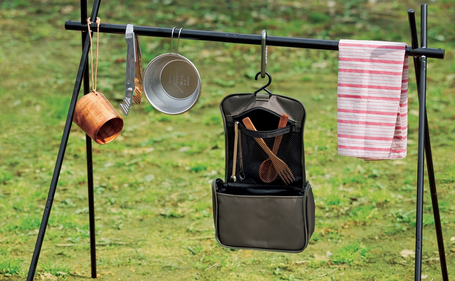 ハンギング用のフック内蔵なので、開けたらそのまま引っかけ可能。テント内はもちろん、キッチンまわりにもかけられるので、スパイスセットやカトラリー入れに最適です。