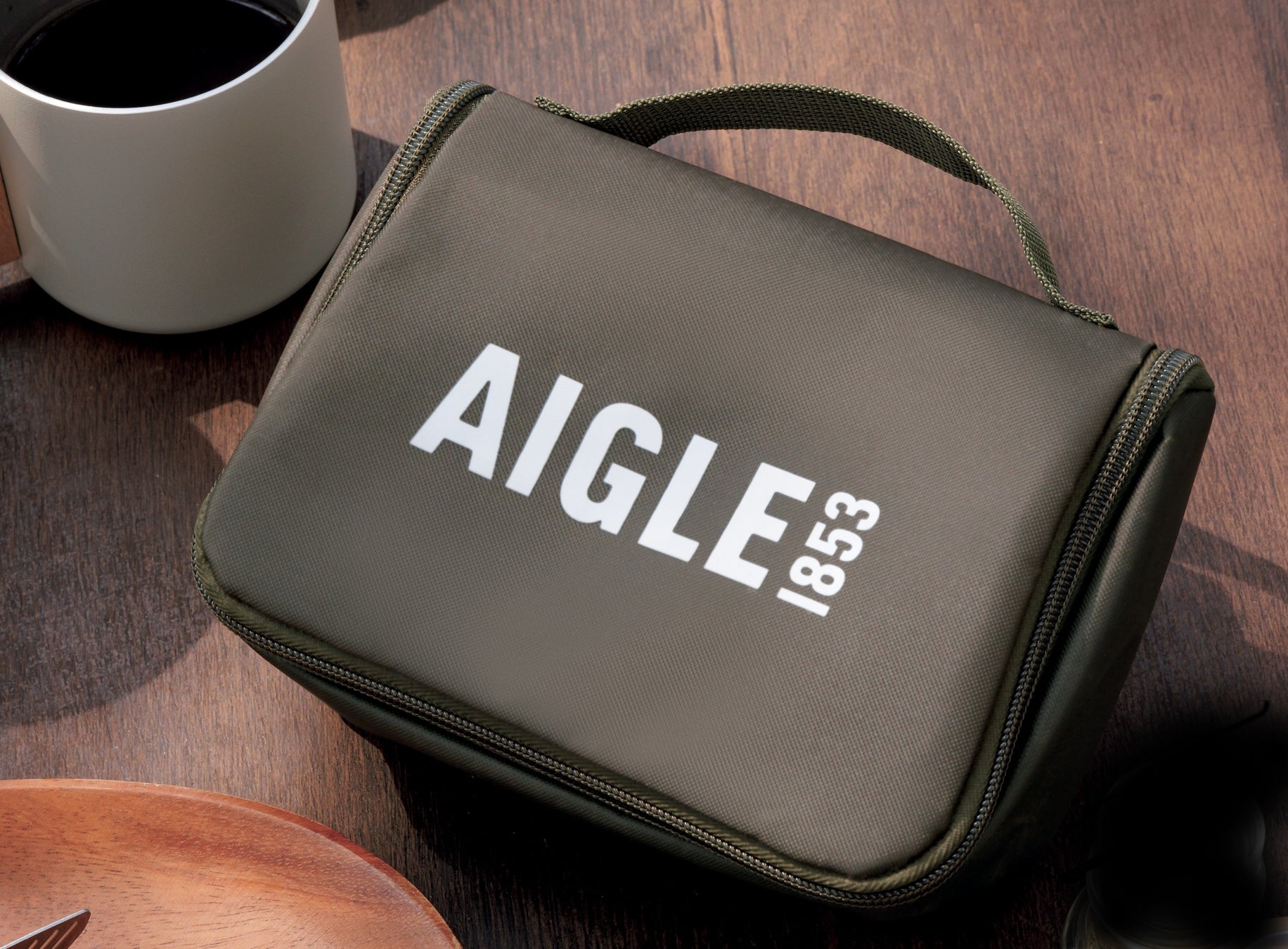 サイズは縦15cm×横20cm×奥行き5cm。カーキのしっかりしたナイロン生地にAIGLEの白いロゴが好印象。持ち運びに便利な持ち手つきで、落とす心配が減りますよ。
