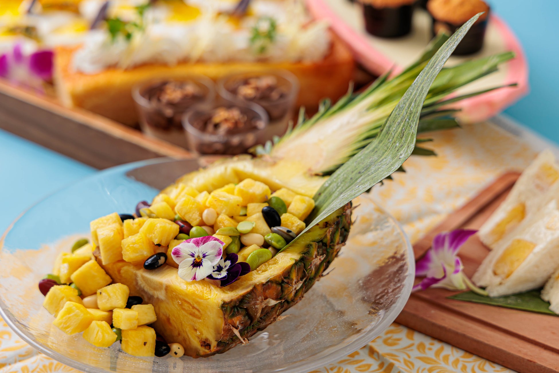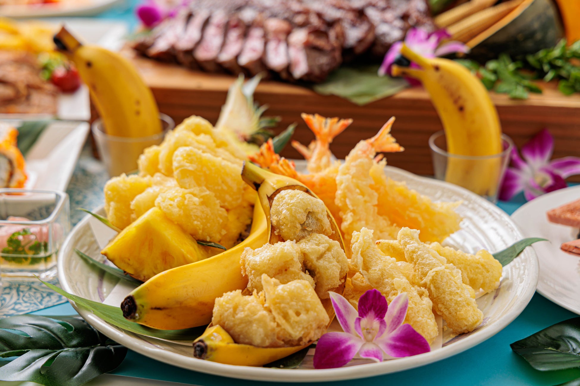 「パイナップルとナッツのサラダ」や、パインのソテーを添えた「ポークハワイアンとオニオンリング」、「マンゴー風味の海老マヨネーズ」やココナッツ香るカレー・パスタなど、フルーツを感じるお料理を存分にお楽しみいただけます。さらに、天ぷらコーナーでは、揚げたての「バナナ天ぷら」や「パイナップル天ぷら」をご用意しました。