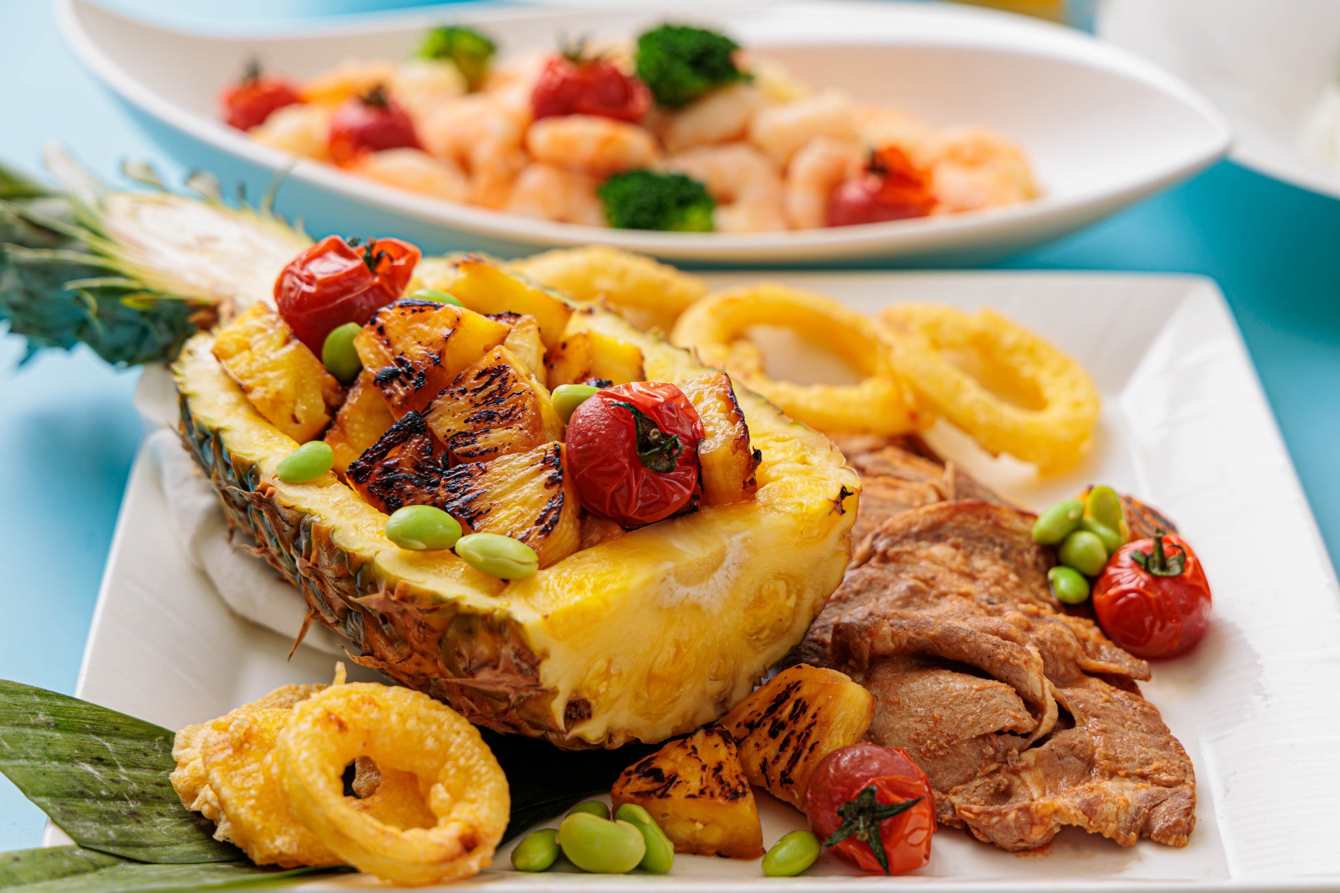 さまざまなハワイアン料理で、パイナップルやバナナを存分にお楽しみください。