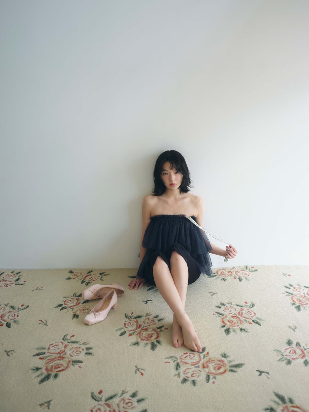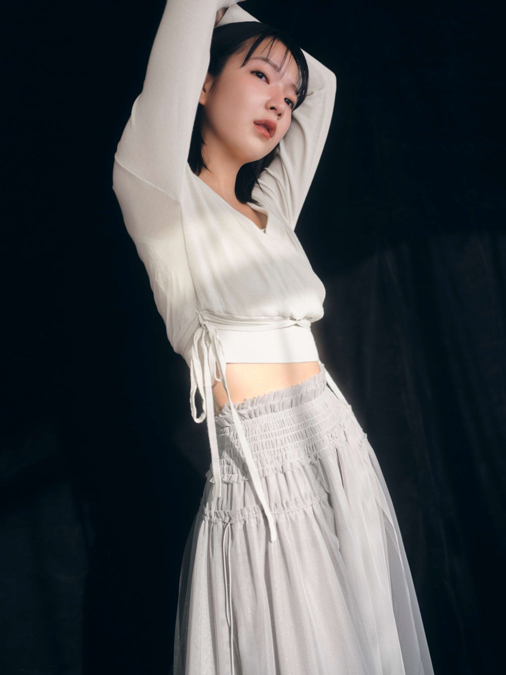 バレエチュチュのようなボリュームを演出できるよう、チュール生地をアシンメトリなティアードデザインでたっぷりと重ねてモードな印象に。