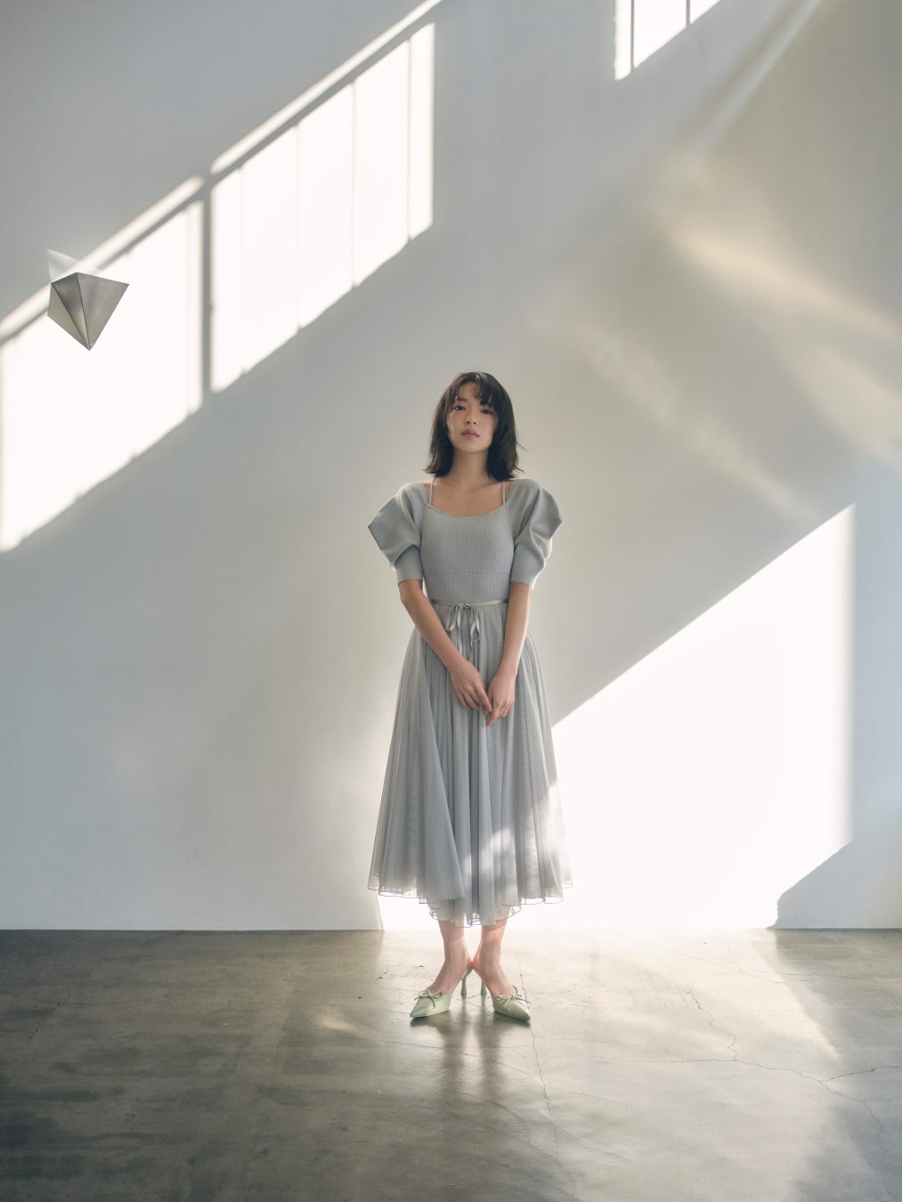 ハリのあるチュール生地と柔らかなチュール生地の異なる素材を重ねて、上品なボリュームを演出しました。