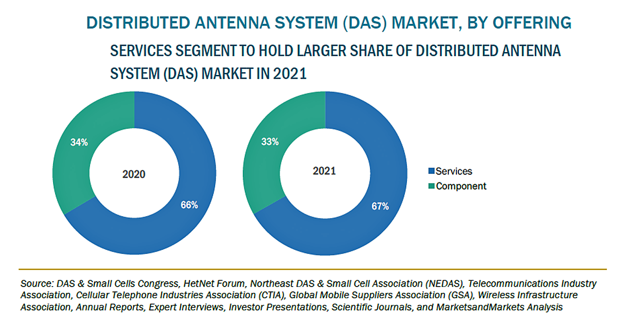 分散型アンテナシステム(DAS)の市場規模は、2021年の87億米ドルからCAGR6.5%で成長し、2027年には127億米ドルに達すると予測されています。また、サービス市場は2027年までに87億米ドル、コンポーネント市場は2027年までに40億米ドルと予測され、それぞれCAGR6.5%、7.0%で成長する見込みです。分散型アンテナシステム(DAS)市場の成長を促す主な要因としては、モバイルデータトラフィックの増加、モノのインターネット(IoT)による接続デバイスの増加、ネットワーク範囲の拡大や中断のない接続に対する需要の高まり、現代的で持続可能なコンセプトに基づく建物の建設が増加していることなどがあります。