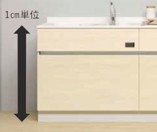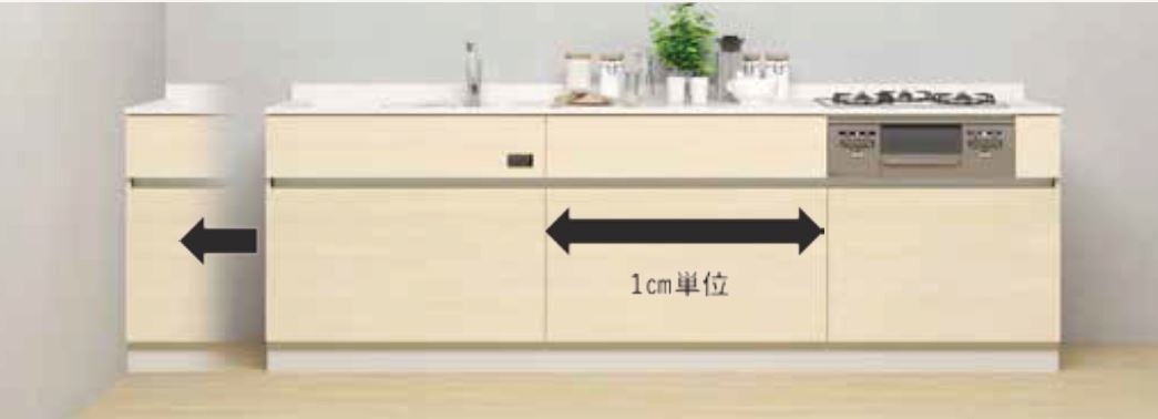 キッチンの高さを使う方の身長に合わせて1cm単位で選んで注文ができるため、作業しやすい高さにできます。横幅も1cm単位でオーダーできるため見た目もスッキリし、部屋の空間に応じて収納の量を増やすことができます。