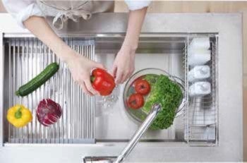 魚や野菜の下ごしらえに便利なアンダープレートを標準装備しています。さらにオプション追加することで多彩なパーツの組合せることができます。例えばシンクの一部を作業スペースに拡張できる穴あきプレートがあります。