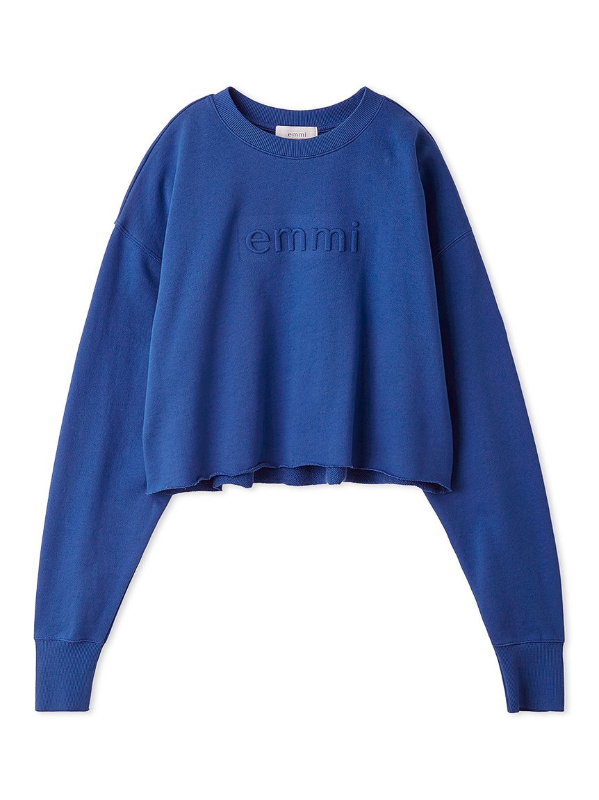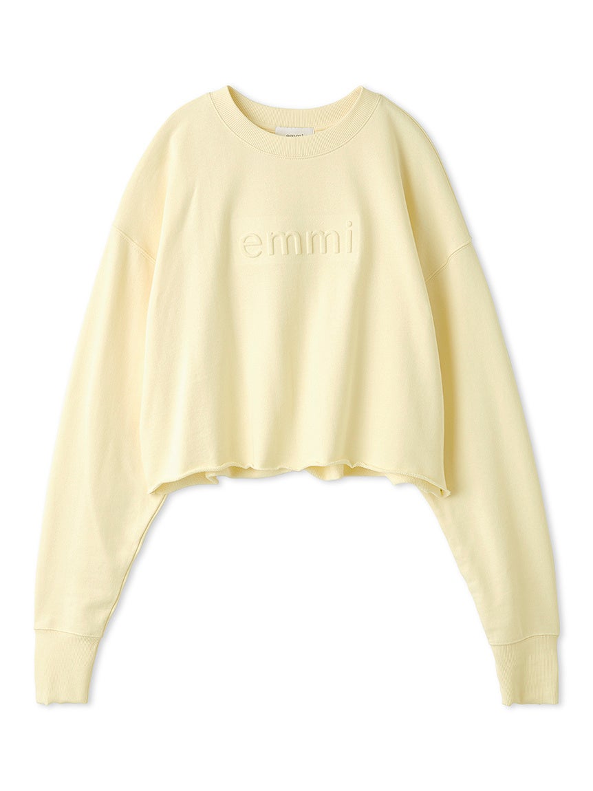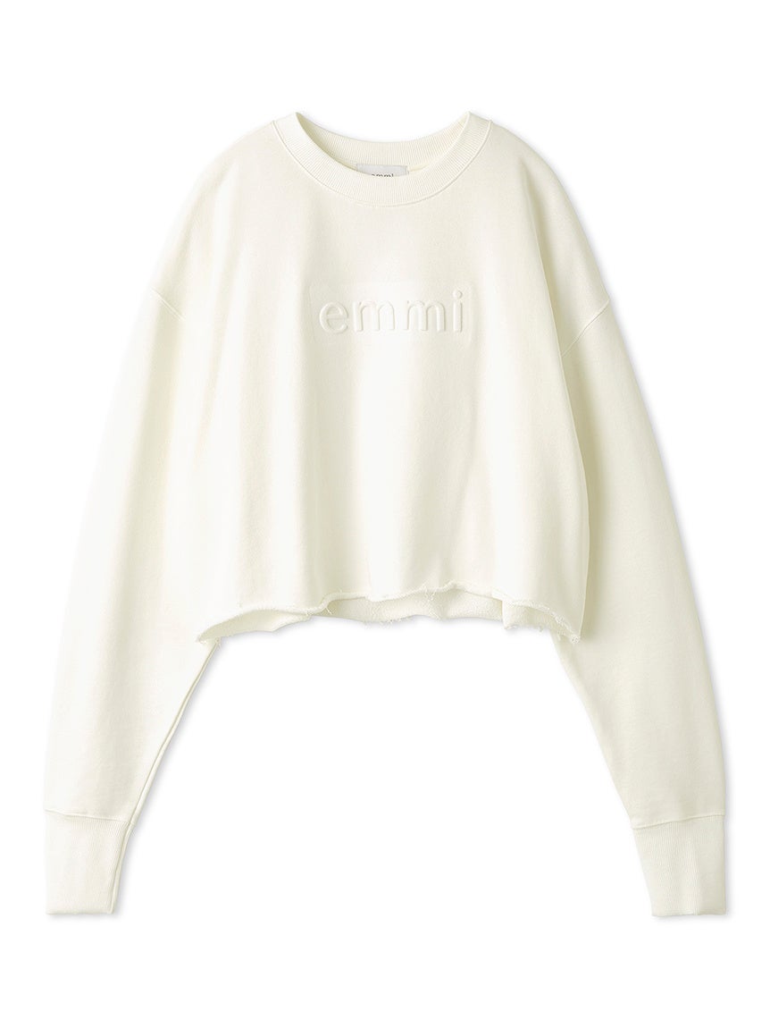 程よい丈感がポイントのemmiロゴスウェット。トップスにはemmiロゴをエンボス加工のように型押ししています。大人っぽさとキャッチーさを兼ね備えたアイテムです。