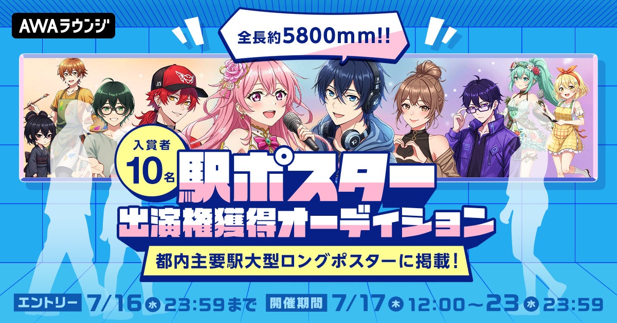 AWA株式会社(本社:東京都港区、代表取締役CEO:冨樫晃己)が運営する、サブスクリプション型(定額制)音楽ストリーミングサービス「AWA(アワ)」は、入賞者10名が都内主要駅大型ロングポスターに掲載されるチャンスを掴めるオーディションを開催いたします。