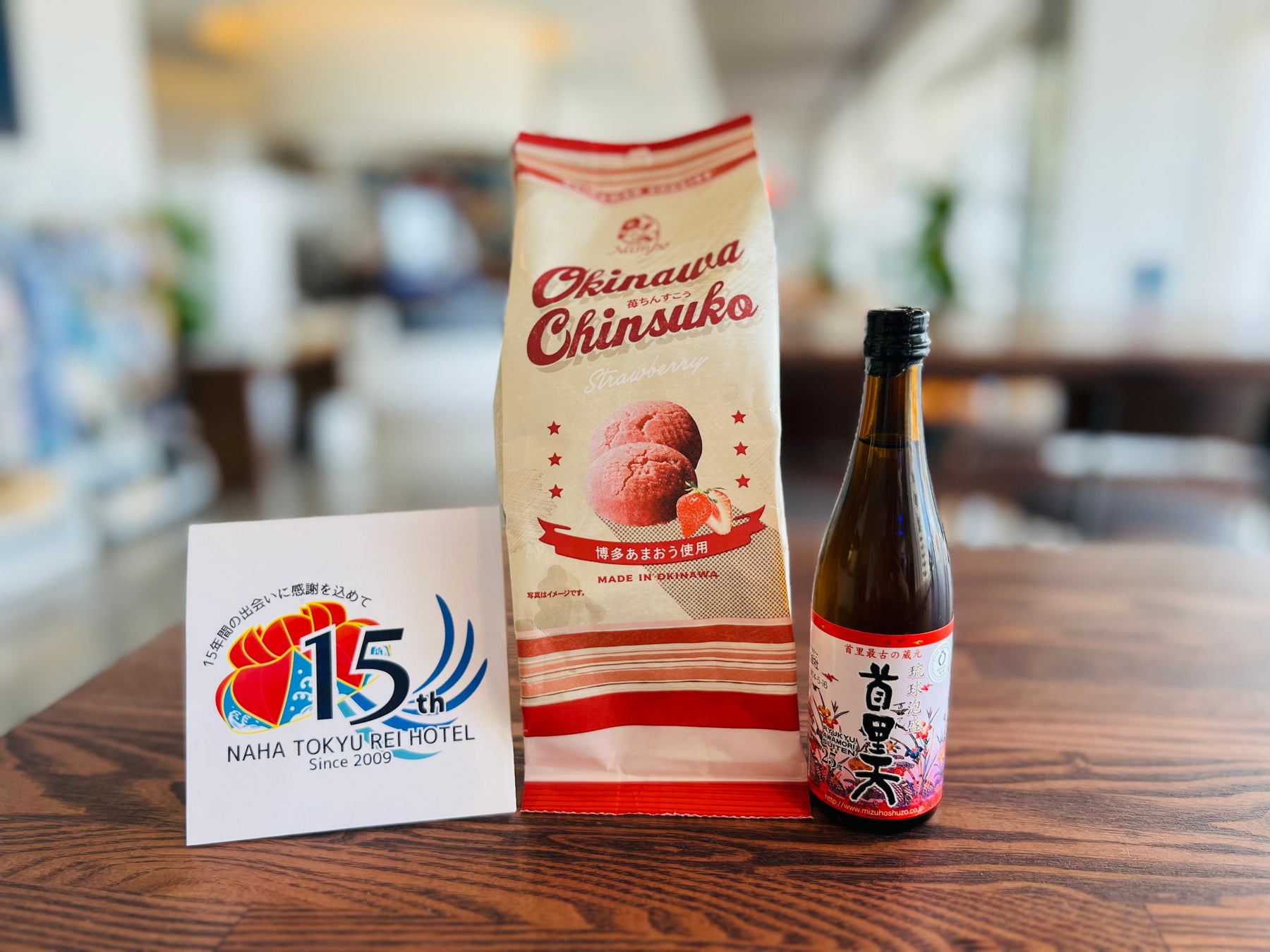 「15周年ありがとうプラン」をご利用いただいたお客様には、15(いちご)に因んだ沖縄の郷土銘菓、苺ちんすこうと琉球泡盛 首里天(すいてん)のミニボトルをギフトとしてチェックイン時にお渡しいたします。