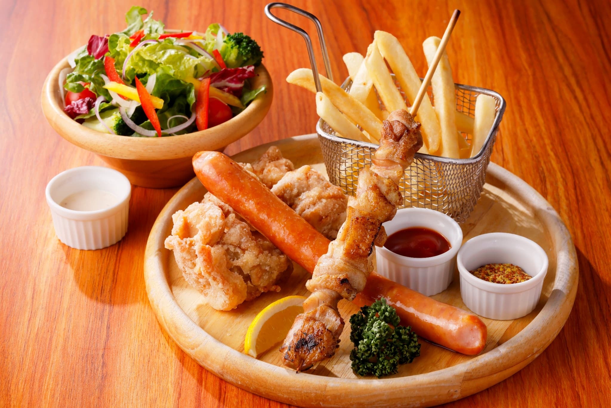 フードメニューには、お酒に合う料理を多数ご用意いたしました。1ポンドステーキやグリルソーセージ4種、海鮮3種などBBQスタイルで楽しめるメニューをはじめ、ちょい飲み目的から「がっつり食べたい!」という方まで、各シーンに応じたアラカルトメニューも幅広くご用意しております。