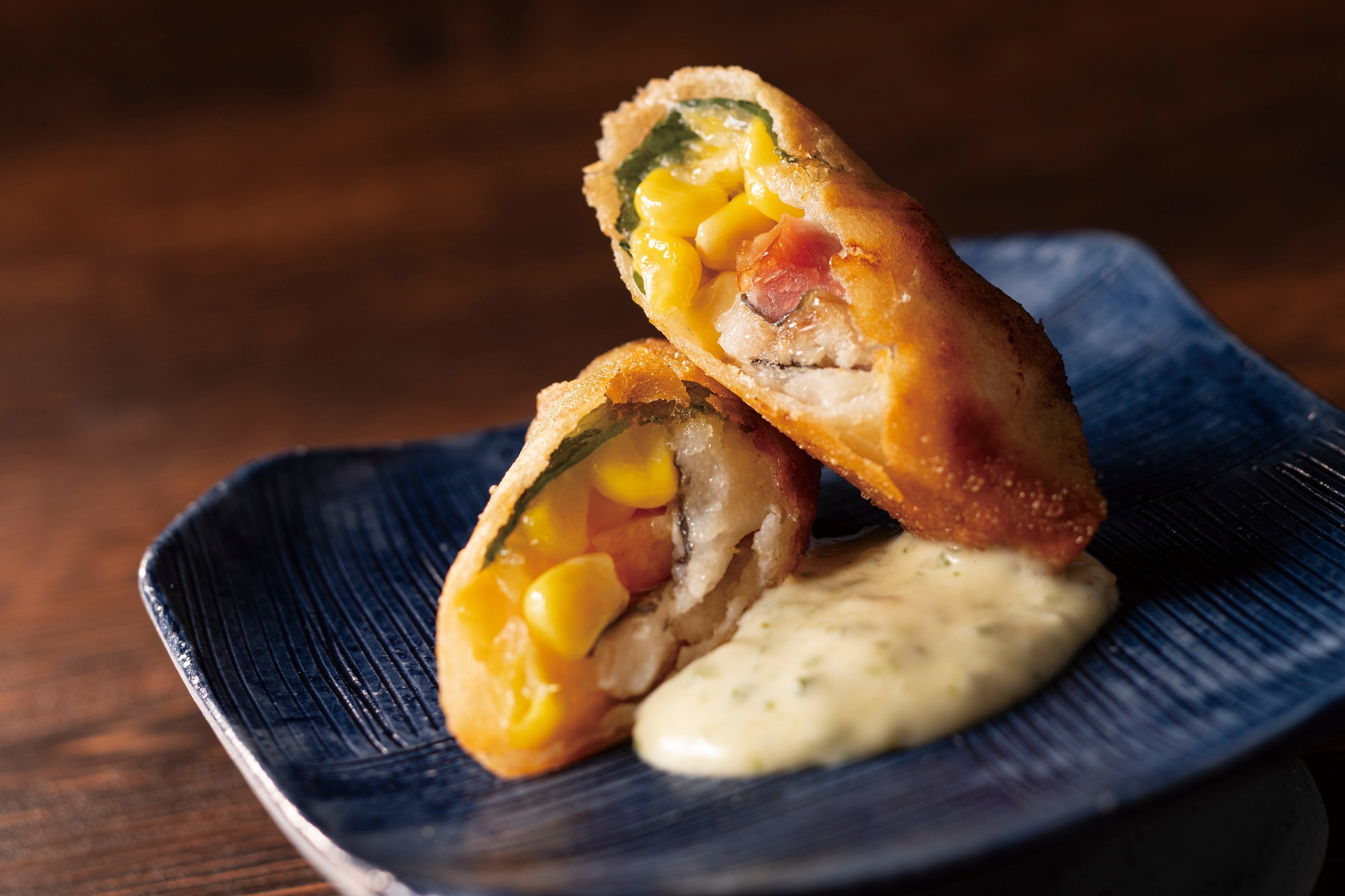 徳島名産の鱧のふくよかな旨味、トウモロコシの食感と甘味、ベーコンの脂が三位一体のバランスを織りなす春巻きが主役です。ヱビスと藍染に共通する“発酵”にフォーカスを合わせ、隠し味として塩麹とすだち胡椒を使用した特製タルタルを添えました。