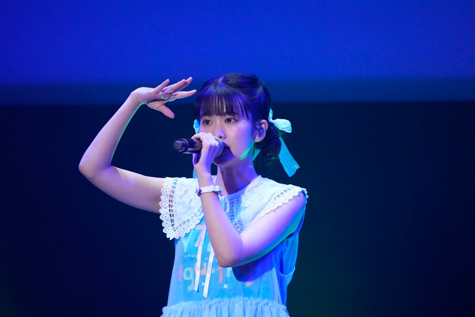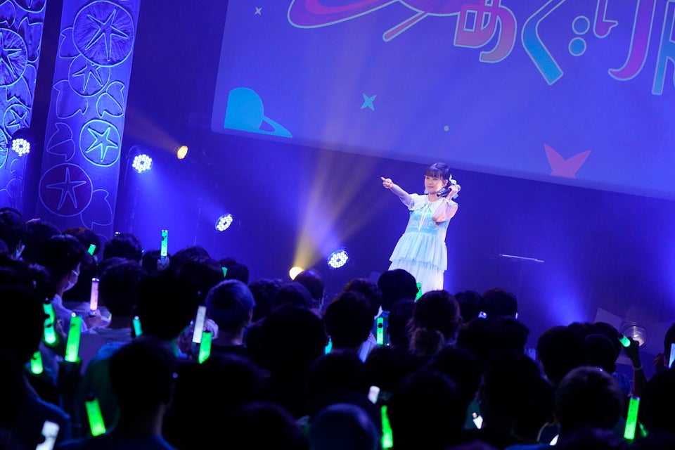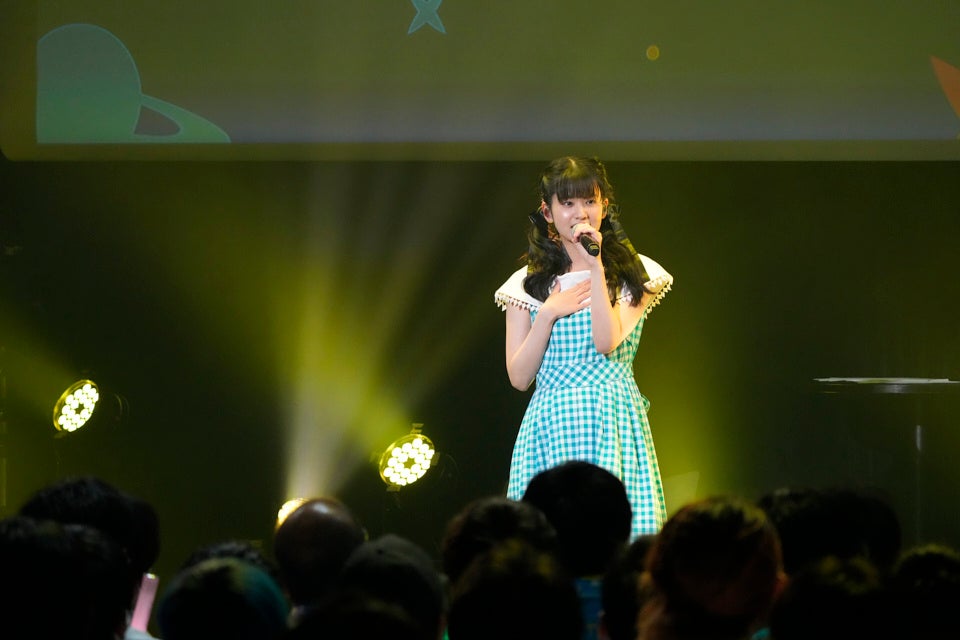 オープニングは1stアルバム『Do you agree?』収録の「NTMUエイリアン」から。オールスタンディングの神田明神ホールに集まったファンは、緑と青のペンライトを振り、サビ前ではクラップをしてライブを盛り上げていく。キュートなダンスをしながら歌う大西亜玖璃=あぐぽん。すました表情の中で、時折笑顔がこぼれるのもかわいらしい。
