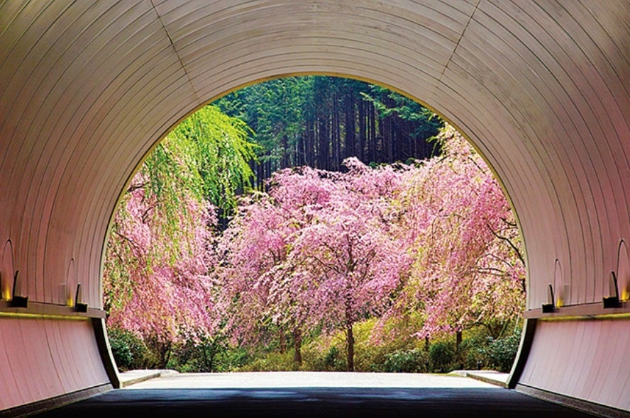 MIHO MUSEUMへ続くアプローチには、約100本のしだれ桜が優美に咲き誇り、並木道を抜けてトンネル方向を振り返ると、まるで絵画の一場面のような美しい風景が広がります。トンネル内では壁面に桜色が反射して淡いピンクに染まり、幻想的な雰囲気に包まれるのも見どころ。特に午前中は光が柔らかく、桜がより美しく映り込む絶好の時間帯。週末は混雑するため、ゆっくり観賞したいなら平日がおすすめです。